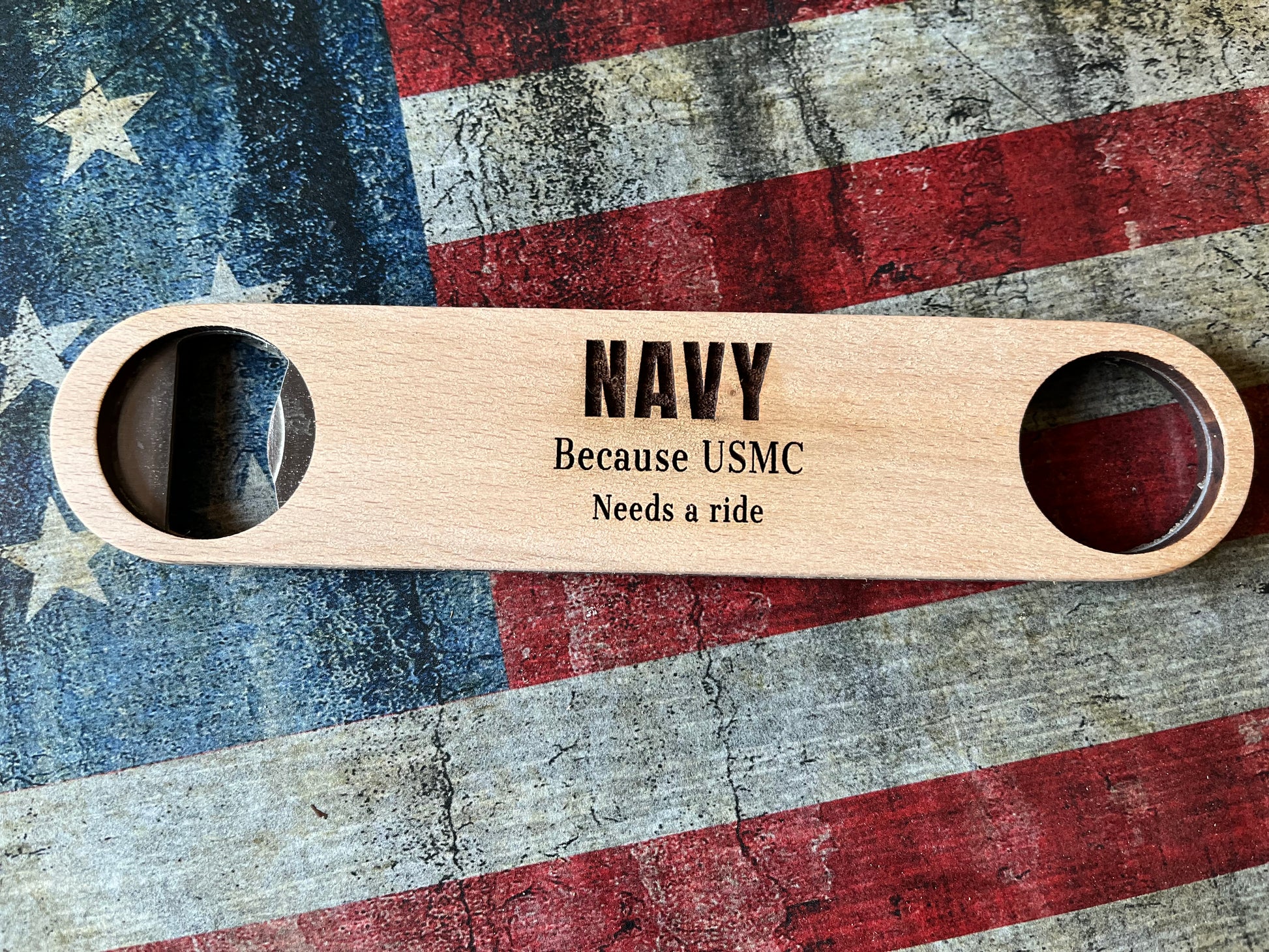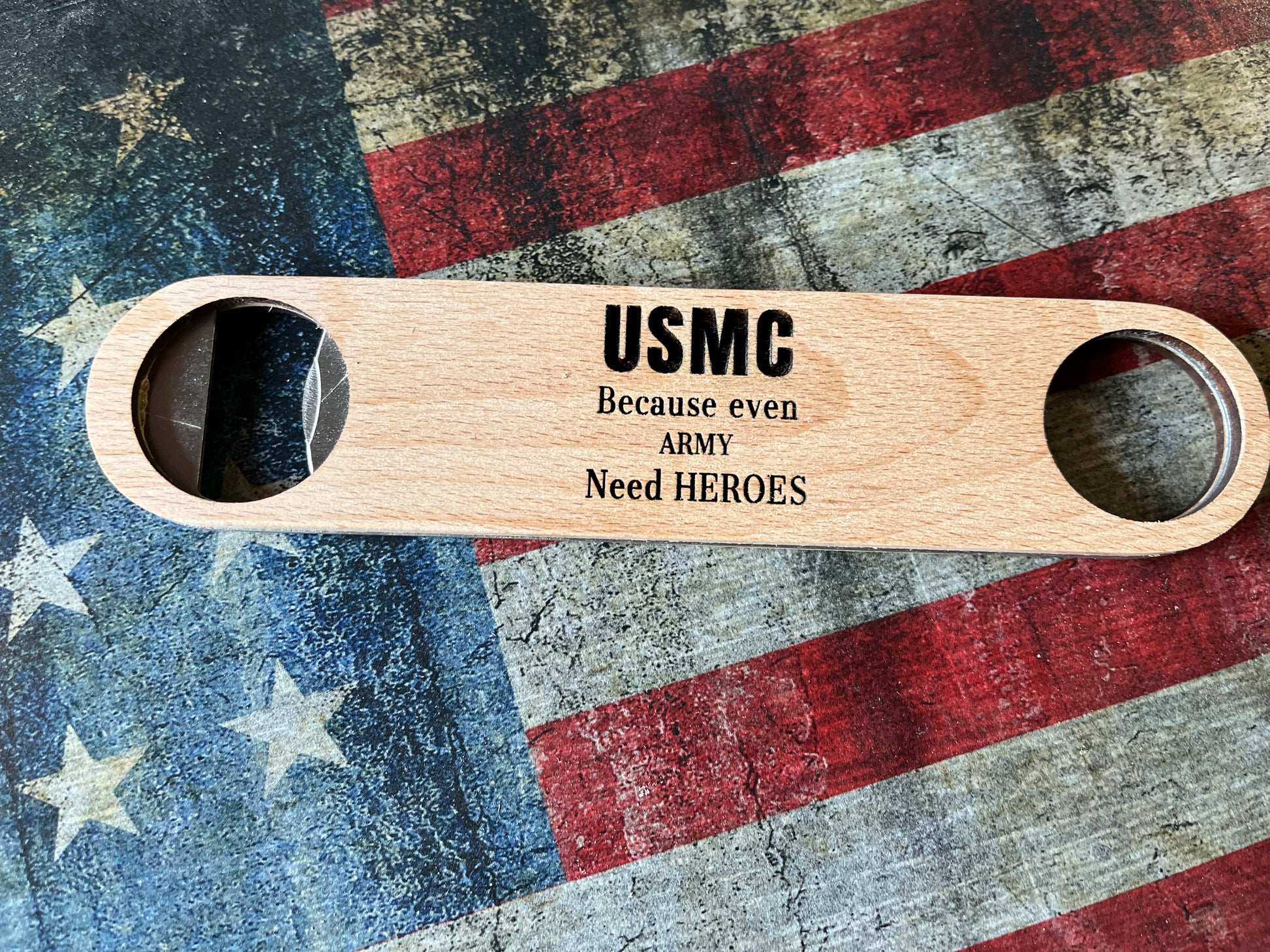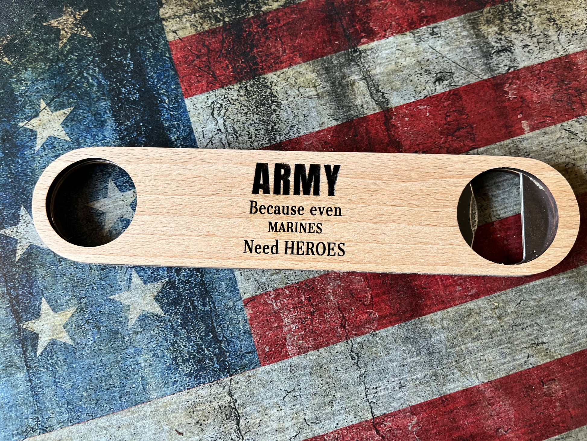 This double sided bottle opener will show your dedication to your branch! Stock your bar with these, and make them honor the Army, no matter what branch they served in! This engraved wooden / metal opener is a great gift, or grab them for your own bar!