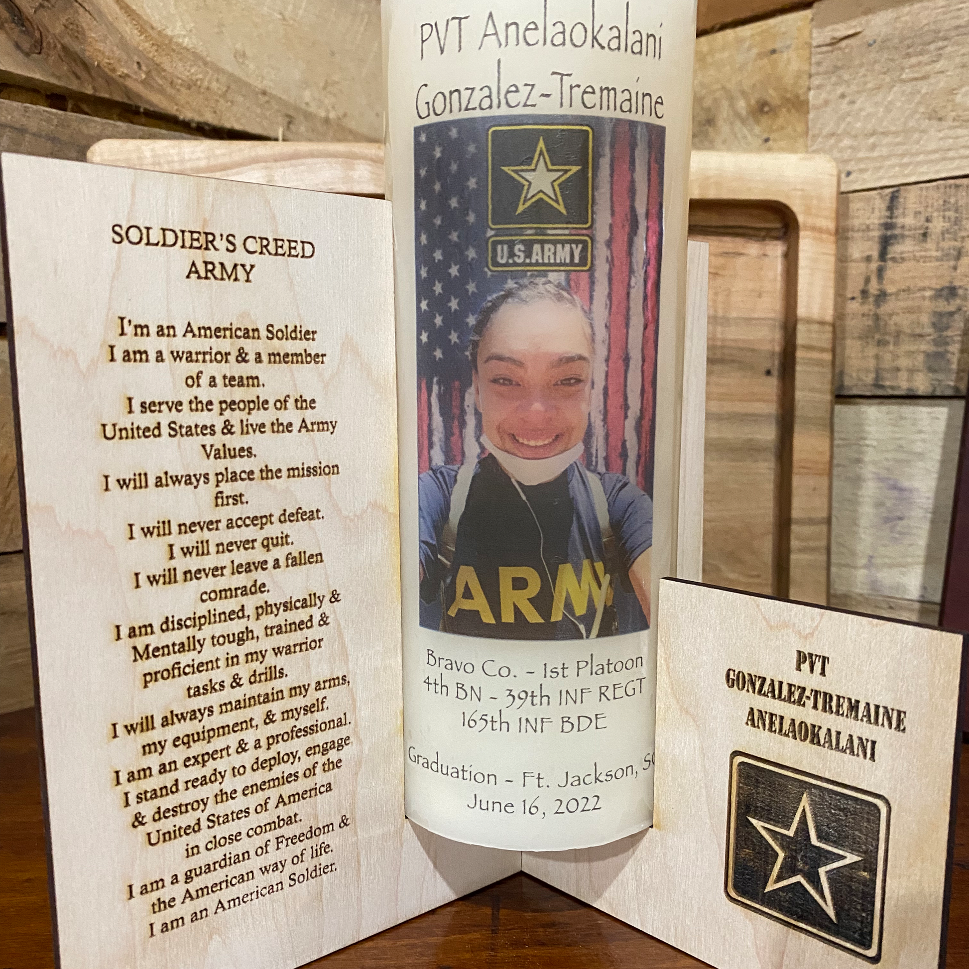 A wooden 2-piece candle holder a wonderful way to display your soldier's candle holder long after The Forge is over. This candle holder is 8" wide by 7" tall and proudly displays your candle forever.