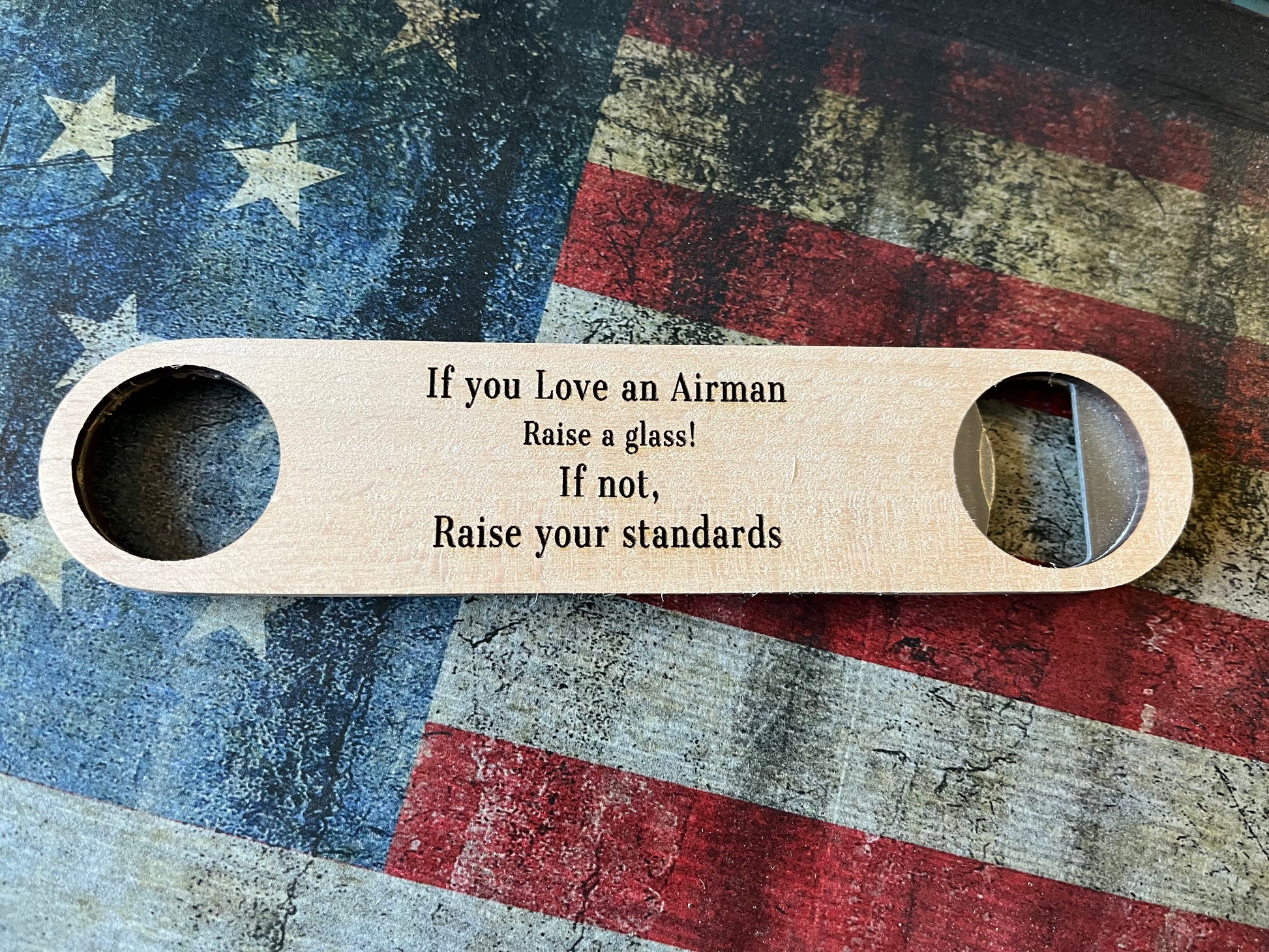 This double sided bottle opener will show your dedication to your loved one, and let others know to raise their standard! Stock your bar with these, This engraved wooden / metal opener is a great gift, or grab them for your own bar!