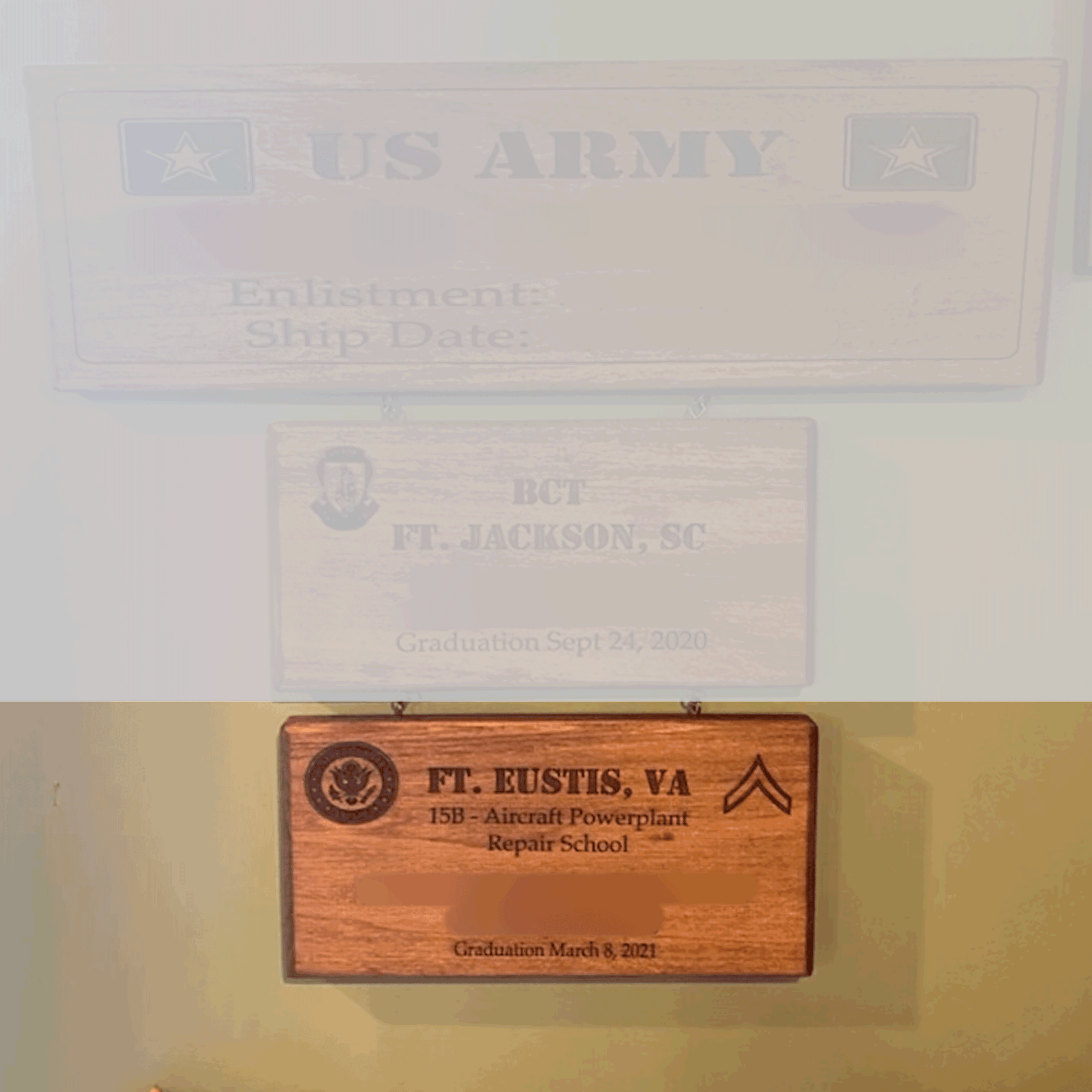 These military career history add-on boards are intended to be added to our Military Service History plaques. Add on boards document the history of your soldier's training posts, deployments, rank advancements, and more!