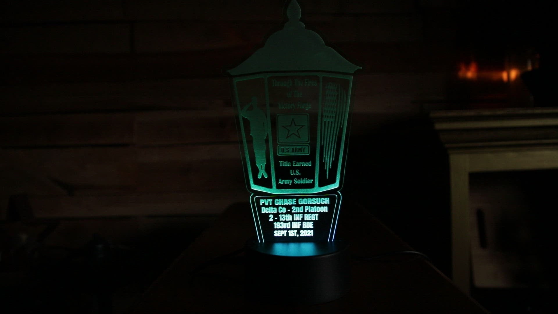 Customize this beautiful, customized, laser-etched LED victory forge light in your choice of green (pictured) or clear acrylic, etched with your soldier's details at the bottom.